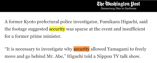 看到的报道,只是有安保人士质疑对一个前首相来说,保安太过稀松,要求调查为什么给山下提供了行凶的机会。
