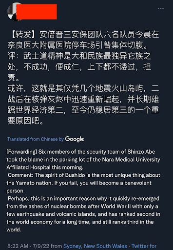 于是又有人传播谣言,说安倍的安保人员集体剖腹。这又是一则假新闻,并未见到有任何正规媒体报道。完全是子虚乌有的杜撰。
