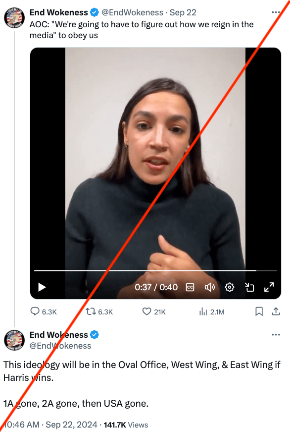 在X平台这段被截取的40秒视频中,AOC的原话是:“包括我在内的一些国会议员谈到了媒体素养(media literacy)。”接着,她提到:“我们需要找到一种方法来控制或管理当前的媒体环境,以防止错误信息和虚假信息的传播。”这句话的英文原话是:“We’re going to have to figure out how we rein in our media environment so you cannot just spew disinformation and misinformation.”