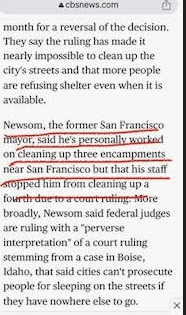 在去年12月的时候,纽森亲自上阵拆无家可归者帐篷。已经拆了三个,但拆到第四个的时候,工作人员飞奔而来,告诉他大事不好,联邦第九巡回法院判决加州强烈拆除无家可归者帐篷非法(下图为CBS新闻的相关报道截屏)。
