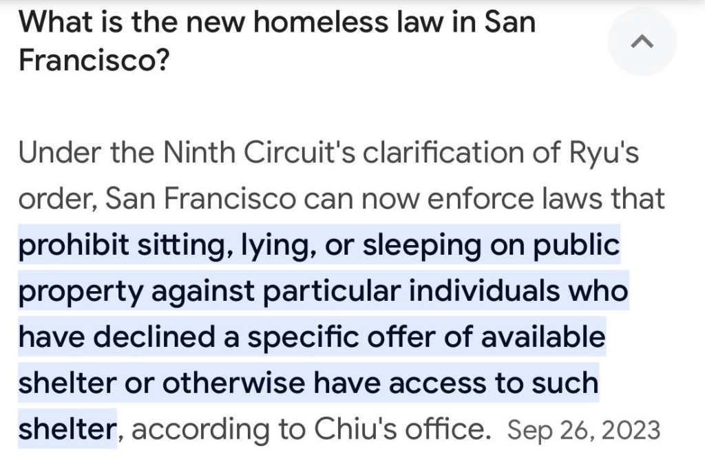 好在今年9月26日,加州联邦法院和加州政府达成和解协议,新法颁布,说如果流浪汉拒绝他们的安置点,他们无权继续逗留在街上坐、躺,睡,而且给他们做决定的时间只有15分钟(下图为相关新法信息截屏)。要不,给他们几天时间考虑,执法难度会大很多,几天后你上哪找去呀?