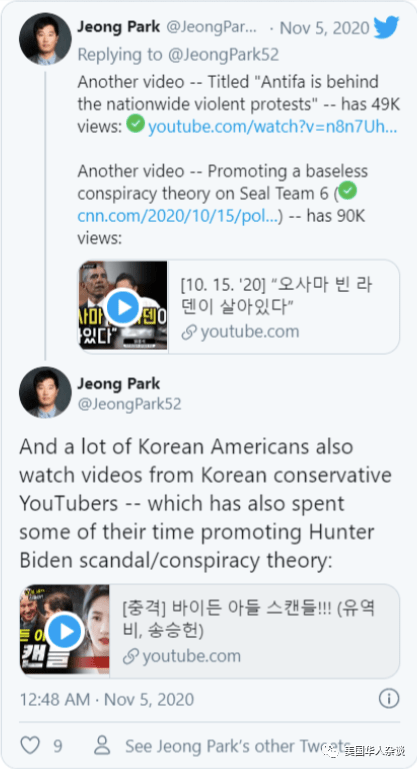 但平台也有责任减轻非英语错误信息的传播,Nguyen 补充说,因为这种现象不再是英语人群独有的。虽然脸书宣布将采取措施阻止与计票相关的选举错误信息,但类似的内容在 YouTube 上仍然可以看到,并获得广泛关注。一位研究人员指出,YouTube 似乎并没有主动推送这类内容,这类内容 “有点难找到”,但有可能是该平台的对围绕美国大选的外语错误信息管控不那么严格。