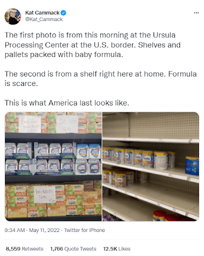 佛罗里达州的共和党议员卡特-卡马克(Kat Cammack)发表照片,将海关和边境保护局(CBP)的一个处理点的所谓奶粉库存与一个半空的商店货架并列。但目前没有迹象表明全国婴儿配方奶粉的短缺与向美国边境羁押的移民婴儿分发配方奶粉有关,虽然卡马克议员在推文中写道”This is what America Last Look Like”, 但她却随后在一则声明中澄清她并不是要提出这一主张。