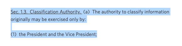第3.1节说,信息的解密或降级应由“授权原始分类的官员,只要这位官员仍在同一职位上任职并拥有原始分类权”等人进行。这意味着,由于拜登作为副总统时拥有最初的分类权,他也有权对他当初分类的信息进行解密。我们尚不清楚在拜登家中和办公室发现的文件是由谁发起的分类。