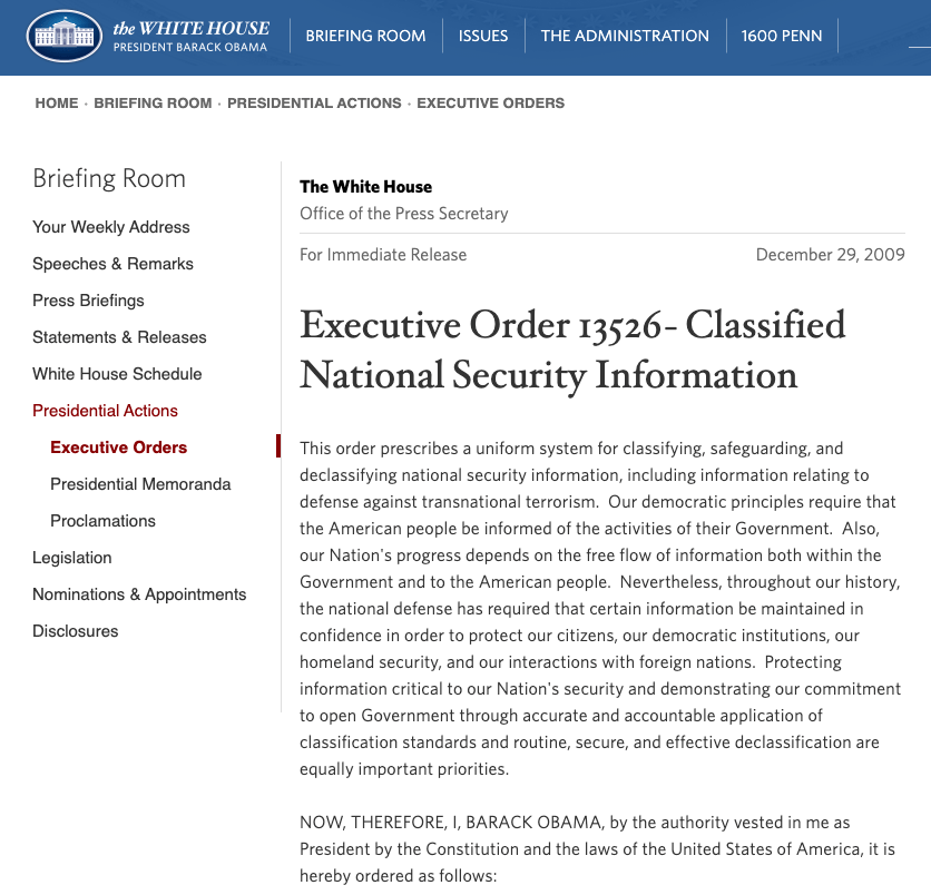 2009年,奥巴马总统发布了名为“机密国家安全信息”的行政命令13526。这项命令第1.3节赋予总统和副总统最初的保密权力,这意味着他们有权启动对信息的分类。