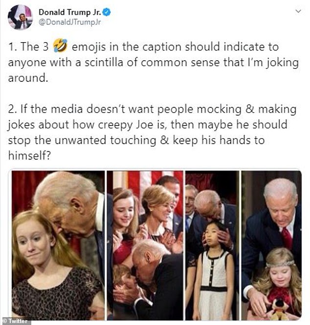 小川普后来在推特上声称他“只是在开玩笑”,然而也重复了这种影射,他说拜登应该停止他 “不想要的抚摸”,并贴出了拜登在白宫活动中与儿童的照片拼贴。