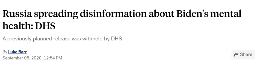 国土安全部公告说,俄罗斯人正在散布 “未经证实的指控”,说前副总统拜登 “健康状况不佳”,并推测 “这种说法会引起一些美国选民的共鸣,并降低他们对他作为候选人的信心。”