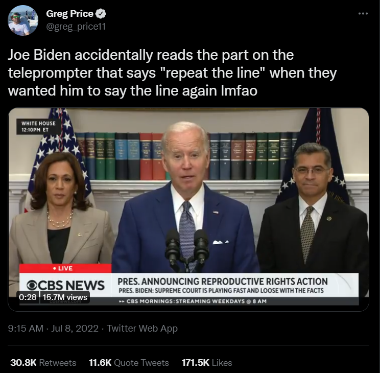 拜登还在演讲中另外两次使用了“结束引用”这一短语,以表示他已经完成了对反对意见的两次引用。这只是拜登在使用提词器时被诬陷有问题的另一个事例而已。