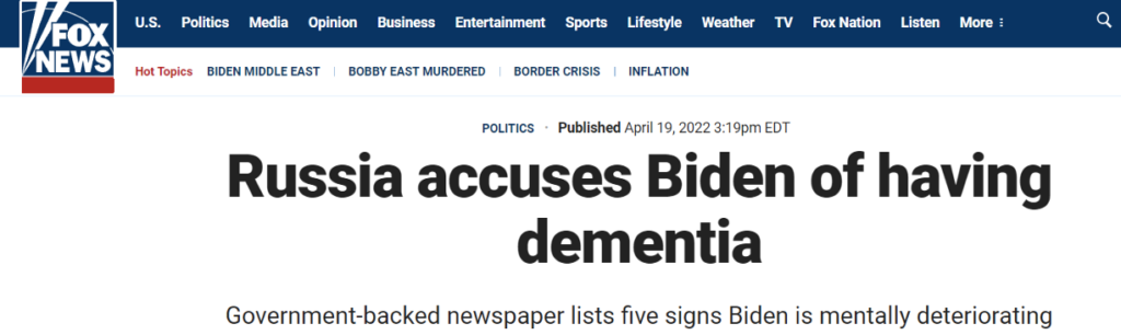 “俄罗斯隐秘的网络大v发布了关于拜登精神健康状况不佳的负面评论和未经证实的指控。例如,代理网站声称,候选人的口误是痴呆症的症状,他在精神上不适合担任总统,而且由于他的年龄,他不太可能完成整个任期。