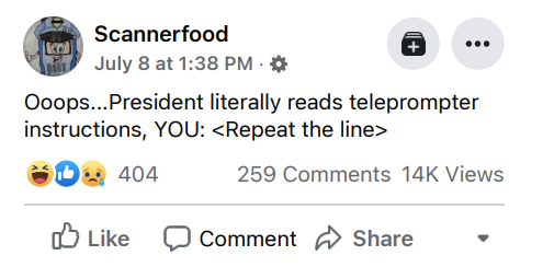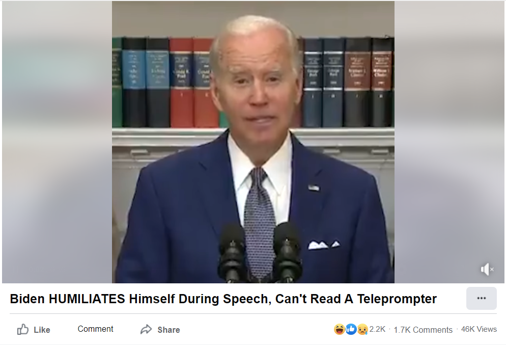 但是社交媒体上的帖子,在分享拜登这段讲话的时候,做了掐头去尾的处理。谎称他在说“结束引用”和“重复一遍”时误读了提词器上的提示,就好像微博上2013年315晚会时发生过的“大概八点二十分发”事件一样,把提示语发了出来。暗示拜登老年痴呆。
