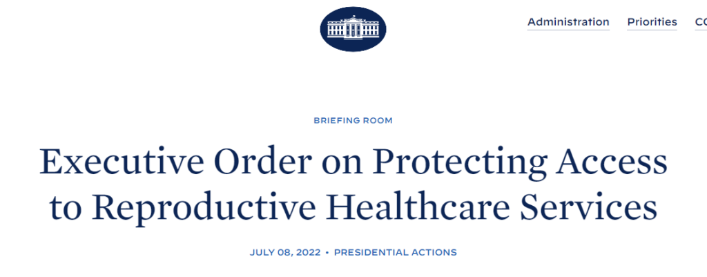 拜登总统于7月8日签署了一项促进获得生殖保健服务的行政命令(executive order on protecting access to reproductive healthcare services),以回应最高法院推翻罗伊·韦德案的裁决。