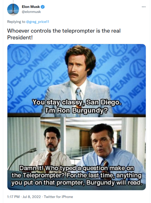 特斯拉网红CEO埃隆·马斯克在回复这条推特时说。“谁控制着提词器,谁就是真正的总统”。他还配了一张美国喜剧电影《王牌播音员》的剧照,电影的主人公伯甘蒂是一个只会敷衍地念提词器的播音员。