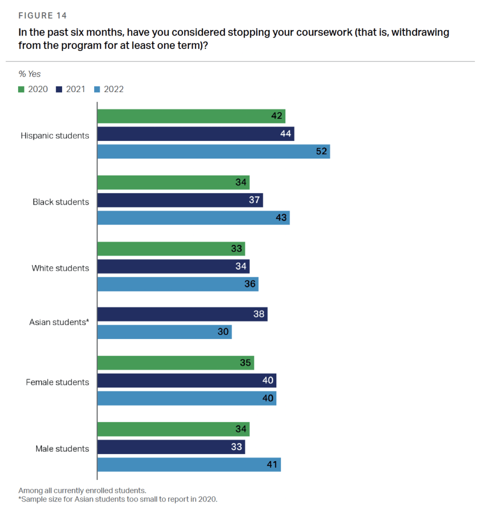 根据Lumina基金会和盖洛普针对全美2023年高等教育状况的研究报告,由于种族歧视、高等教育的高成本和众多的外部责任,黑人大学生在任何类型的学位或证书课程的六年完成率都比其他族裔群体低。黑人大学生的入学率在过去10年有所下降,全局来看,只有35%的美国黑人拥有副学士或更高的学位,较高的学历对经济和社会流动至关重要。报告显示,黑人本科生作为照顾者或者全职工人是其他本科生 (18%) 的两倍 (36%),同时该报告建议,学校需要增加财政援助,提供更灵活的课程作业来帮助有困难的学生完成学业。