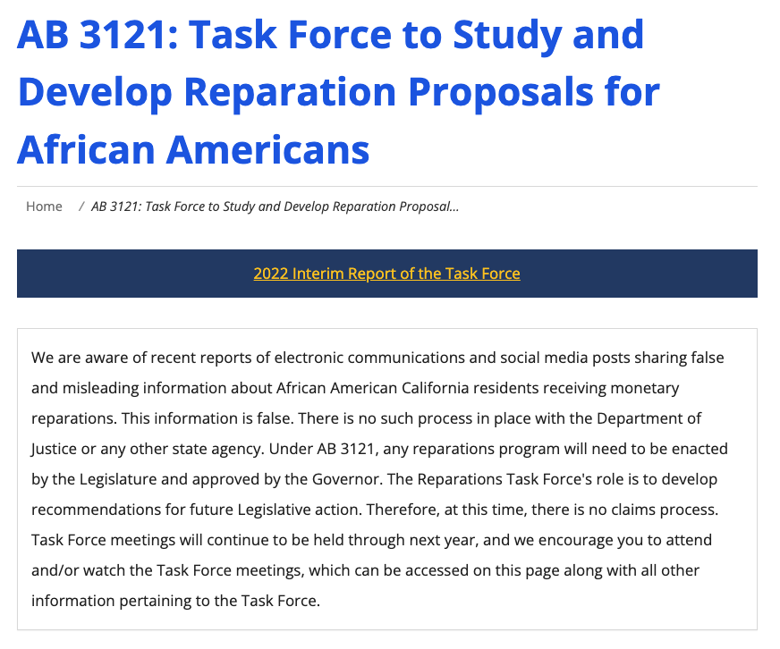我们知道最近有报道称,电子通信和社交媒体帖子分享了关于非裔加州居民获得金钱赔偿的虚假和误导性信息。这种信息是错误的。司法部或任何其他州机构都没有这种程序。根据AB3121法案,任何赔偿计划都需要由立法机构制定并由州长批准。赔偿工作组的作用是为未来的立法行动制定建议。因此,在这个时候,没有索赔程序。