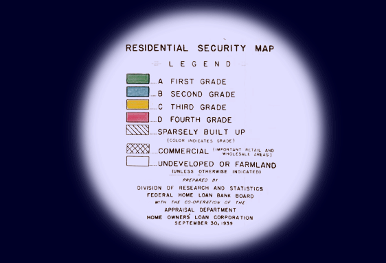 “红线”政策(redlining)指的是政府通过划定红线、指定分区条例、决定在何处修建学校和高速公路以及歧视性的联邦抵押贷款政策,造成了种族隔离。简单说,被红线勾勒出的区域是城市中被认为有高违约风险的部分(D等,第四等也是最低等),银行和其它抵押贷管机构会拒绝向这些区域的借款人提供贷款。被红线划分的通常是非裔和西班牙裔的社区。