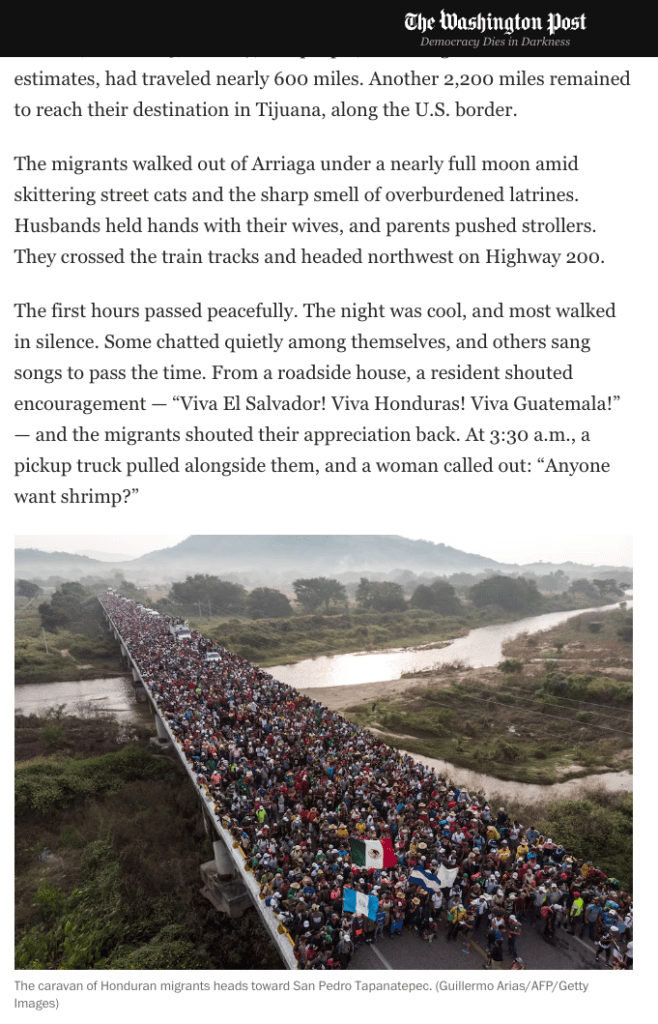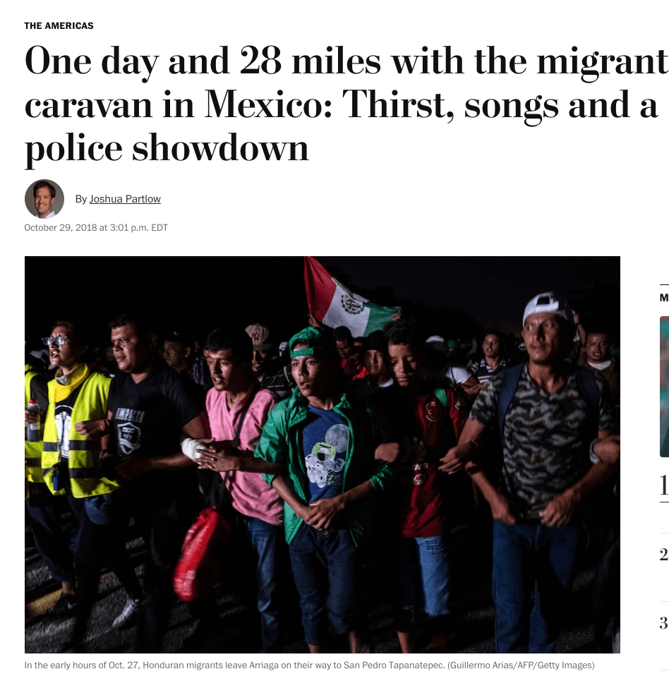 在这篇名为《在墨西哥与移民大篷车队一起走了一天和28英里: 饥渴、歌曲和警察的摊牌》的报道中,邮报讲述了一支这支由3000至7000人组成的大篷车队,从洪都拉斯的圣佩德罗苏拉开始,行驶了近600英里,还有2200英里才能到达他们的目的地——美国边境的蒂华纳 (Tijuana) 。