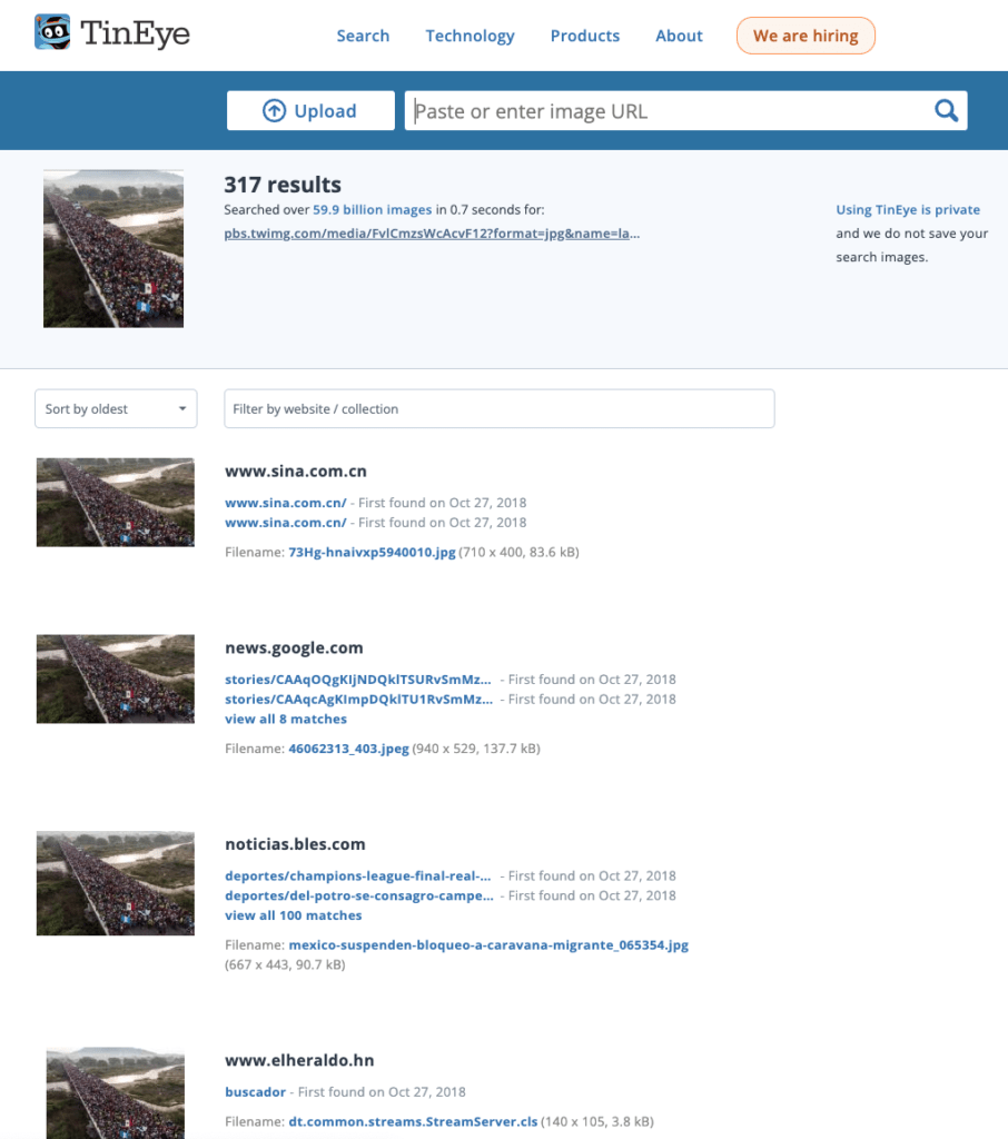 将帖子的图片在搜索引擎TinEye中反搜,可以在结果中发现此图最早出现在2018年,并不是当下的边境实景。