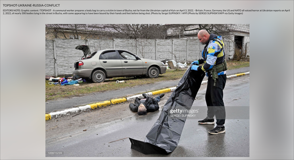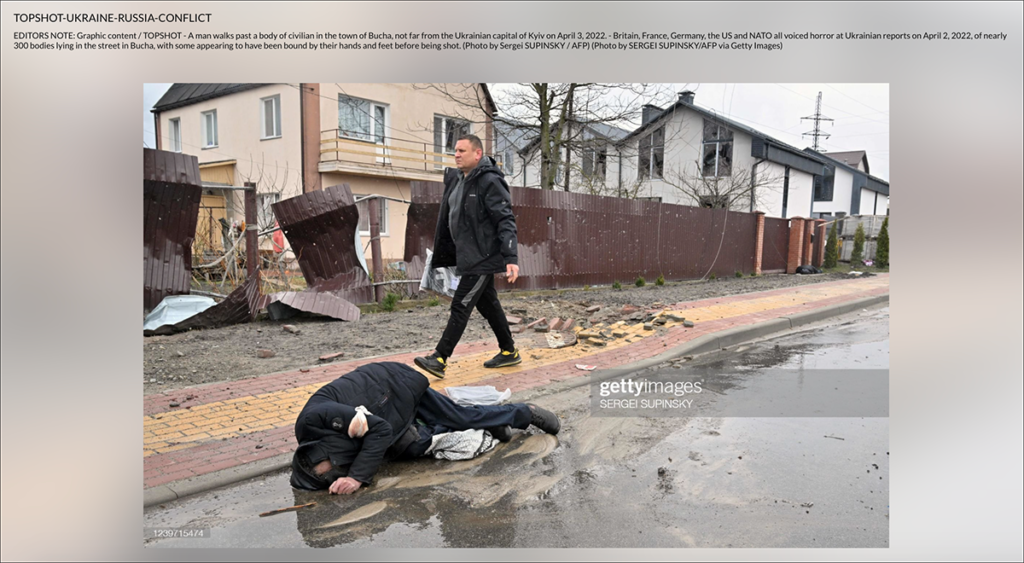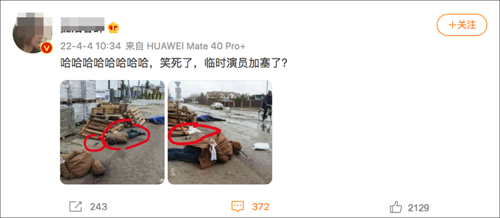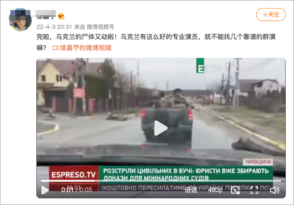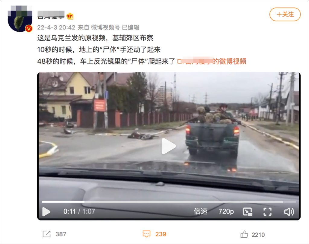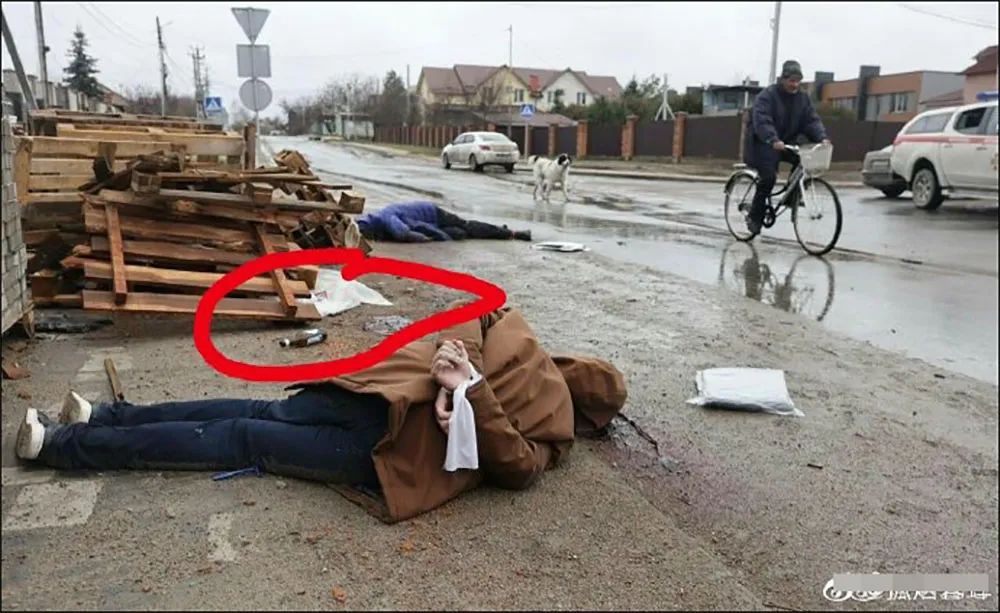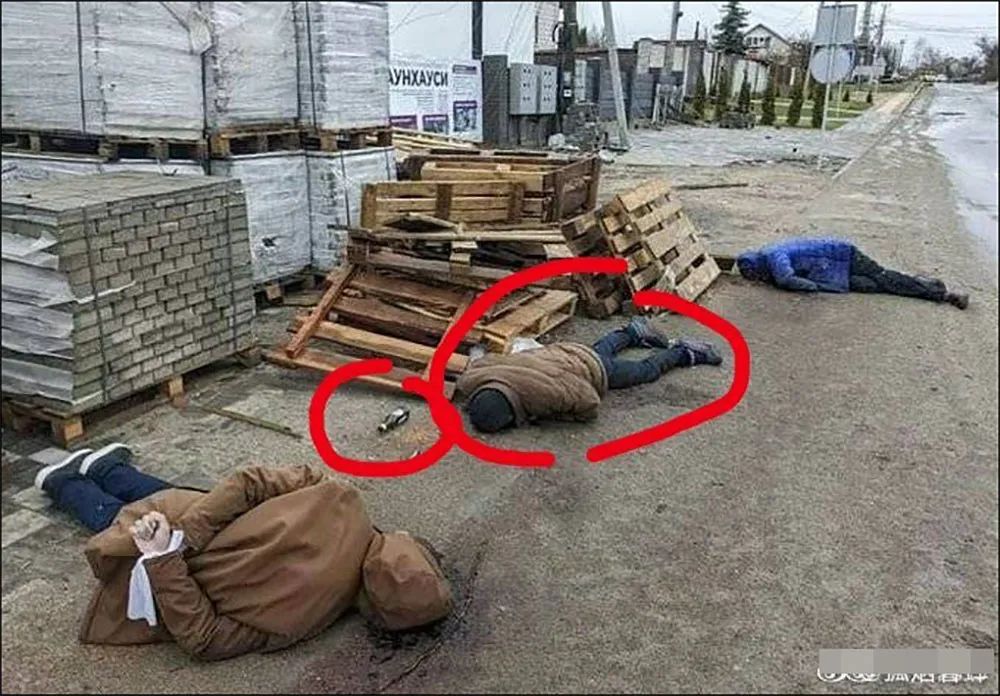 中文网络广泛流传一段乌克兰军队重新控制基辅西北部的布查市(Bucha)后拍摄的视频,视频中可见街道上有大量尸体。同时,也有质疑这段视频真实性的说法。