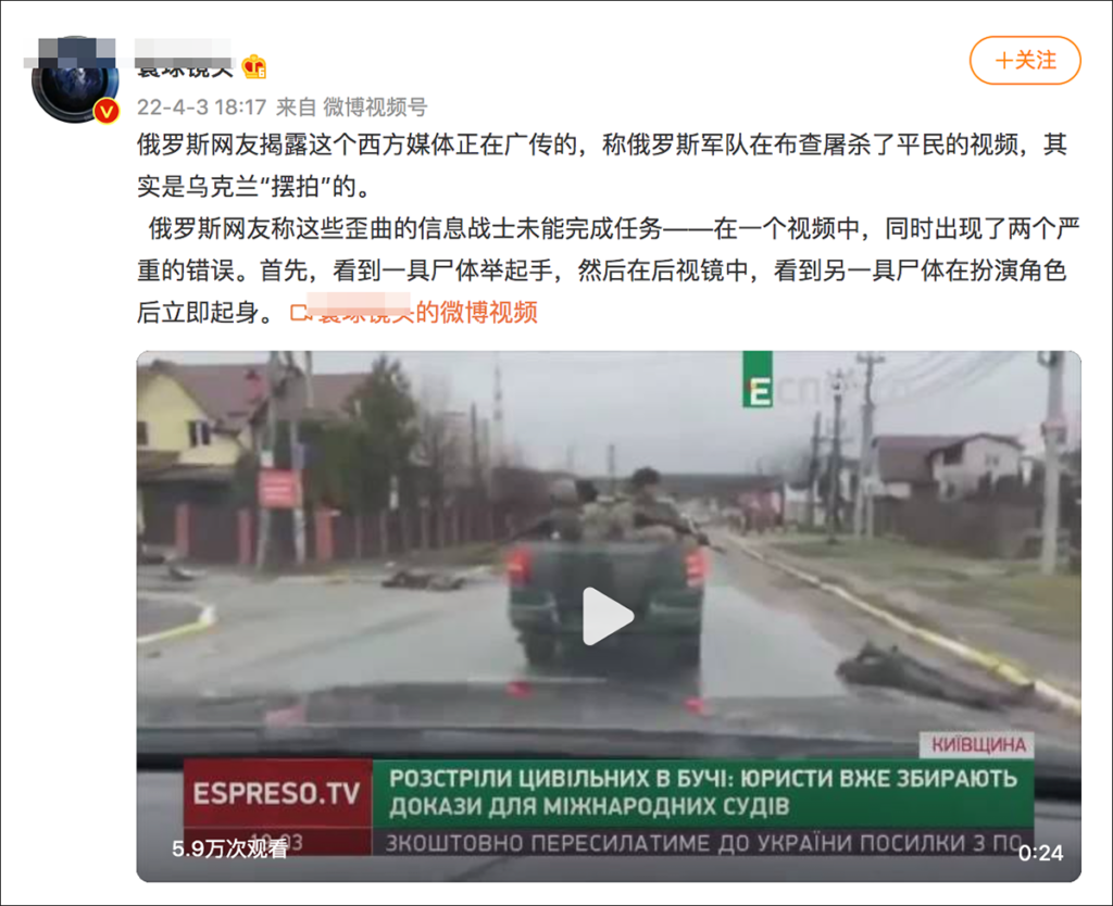 此前,环球网、央视新闻客户端引述俄罗斯国防部的声明报道称,“当地时间4月3日,俄罗斯国防部称,所谓在布查市的’犯罪证据’在4月3日俄军撤离的第四天,乌军和乌克兰媒体抵达以后出现了。这些来自布查市的照片和视频都是乌克兰政府为西方媒体导演的,是乌克兰政府的又一次挑衅行为。”
