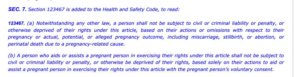 “每个加州人都应该有权利感到安全,他们可以在怀孕期间寻求医疗援助,而不必担心民事或刑事责任。 当一个人担心国家会对他们采取与怀孕有关的行动时,他们就不太可能在需要时寻求医疗服务。如果他们确实寻求医疗服务,因实际的、潜在的或指称的怀孕结果而惩罚他们,就会干扰专业护理,并危及提供者和病人之间的关系。”