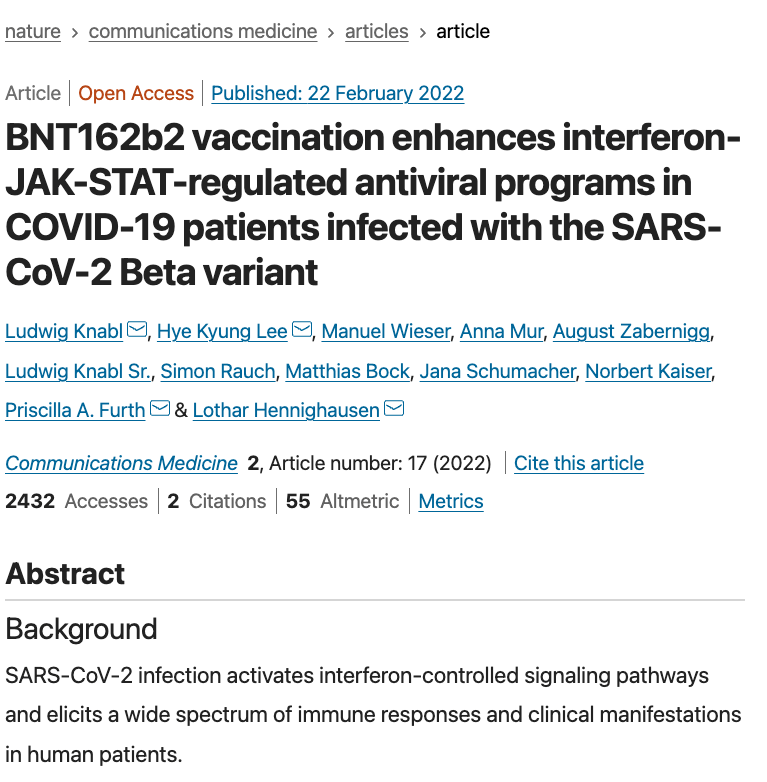 并说“该杂志发表了几个mRNA研究人员的研究结果,我们引用的是,’在这篇论文中,我们提出证据,疫苗接种会诱发一型干扰素信号的深刻损害,这对人类健康有多种不利后果’。”