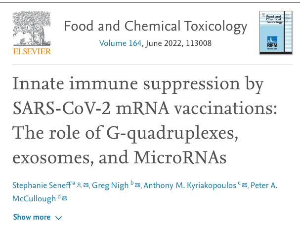 在7月21日的节目中,卡尔森引用《食品和化学毒理学》杂志(Food and Chemical Toxicology)的文章《mRNA的内在免疫抑制》(原文标题如下),发布于2022年6月。