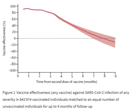 简单说,这篇研究的结论是:疫苗的有效性随着时间的推移而下降,意味着疫苗提供的保护不是永久性的。该研究认为这坚实了实施加强针的理由,建议进行第三针新冠疫苗的接种。