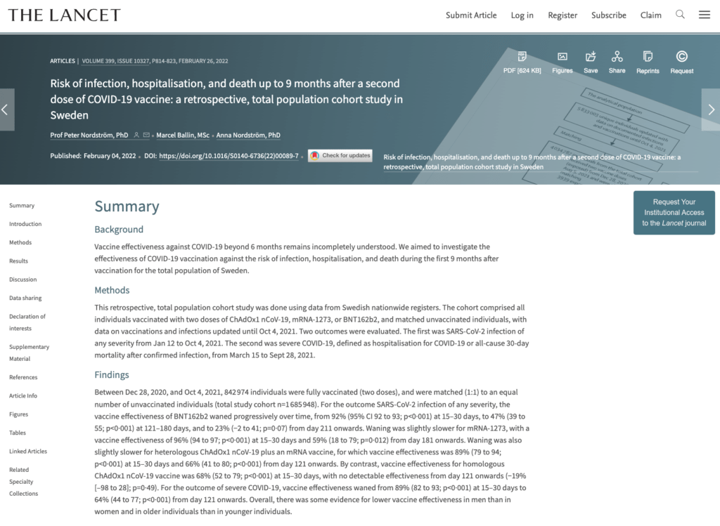 《柳叶刀》原文《第二剂新冠疫苗接种后9个月内的感染、住院和死亡风险:瑞典的一项回顾性总人口队列研究》发布于今年2月。研究发现,疫苗对任何严重程度的感染的有效性都会随着时间的推移而减弱,不同的疫苗类型(瑞典使用两种mRNA疫苗和阿斯利康疫苗)有一些差异。疫苗对严重的新冠病毒的保护作用减弱较少——但四个月后仍有一些减弱。