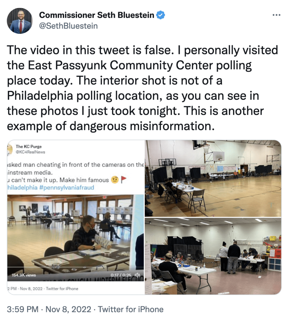 费城市选举委员会专员的共和党人塞斯·布鲁斯廷(Seth Bluestein)发推反驳视频内容,推文如下:”这条推文中的视频是假的。我今天亲自去了东帕斯杨克社区中心的投票站。视频中建筑内部拍摄的并不是费城的投票地点,你可以从我今晚刚拍的这些照片中看到。这是另一个危险的假信息的例子”。
