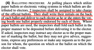 根据威斯康星州选举法的规定,在有纸质选票的投票站,需要有两名检查员在“每张选票背面写上检查员的名字缩写,并在每个选民进入投票站时将选票交给ta”。