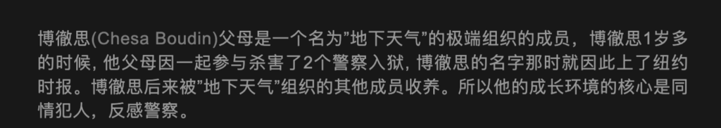 有人指控说博彻思的父母是极端组织的成员,所以博彻思的成长环境的核心是同情犯人,反感警察。