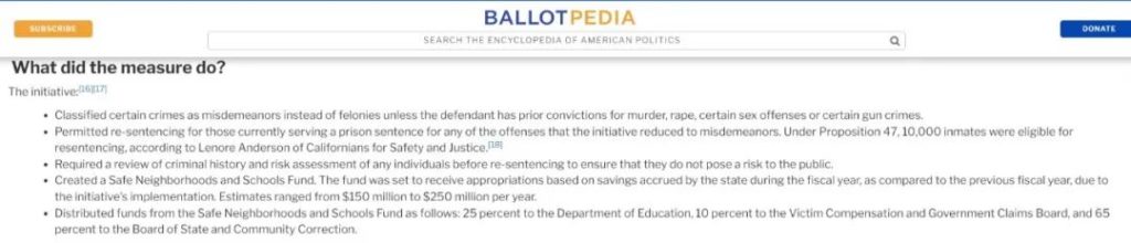 加州的47号提案(Prop 47),就是店内偷窃等犯罪金额在950美元以下的按轻罪(misdemeanor)入罪而不算重罪(felony)的一个法案,一直具有争议,也称为各种网络谣言的缘起,就是所谓的“950元以下不算犯罪”,或者简化为“零元购”,这是长期流传于华人圈的经典虚假信息。