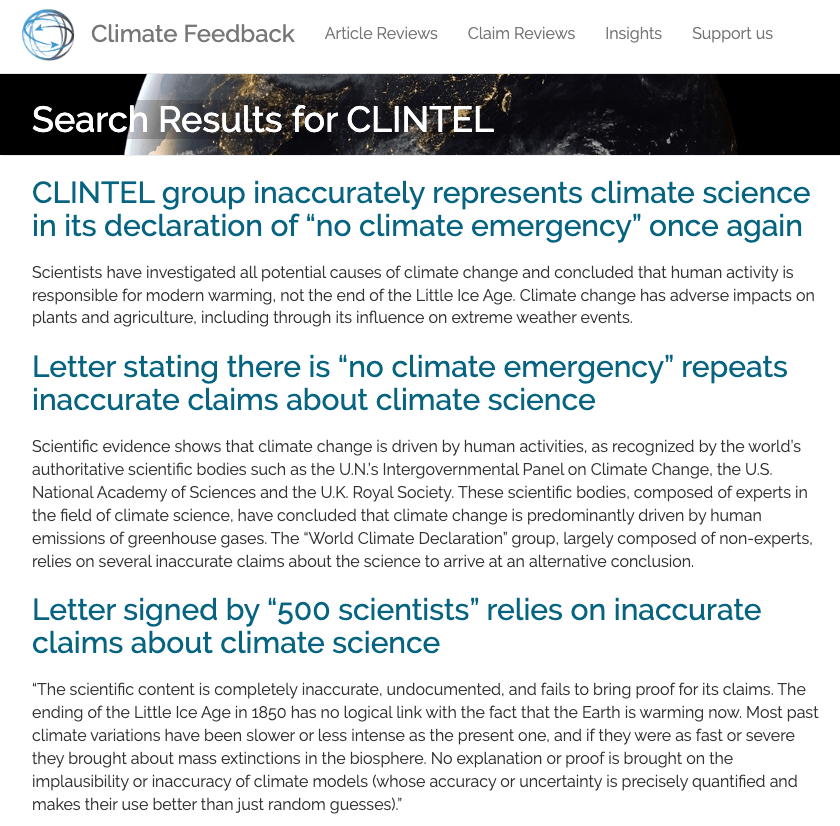再来看看文中提到的机构“全球气候情报小组(CLINTEL)”,根据该机构的介绍页面,这是一个在气候变化和气候政策领域开展活动的独立基金会。其联合创立者古斯·贝尔霍特(Guus Berkhout)发起《世界气候宣言》,可以简单概括为“气候紧急事态不存在”,这同样也是该机构的立场。