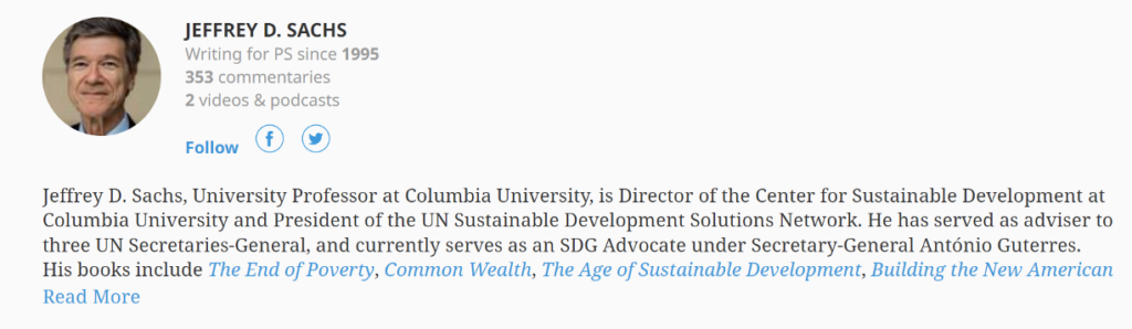 对于发布文章的这位杰富瑞·萨克斯(Jeffrey Sachs)教授,来自维基百科的介绍称,他是美国经济学家,专长于发展经济学,以担任拉丁美洲、东欧、前南斯拉夫、前苏联、亚洲和非洲的经济顾问而闻名。