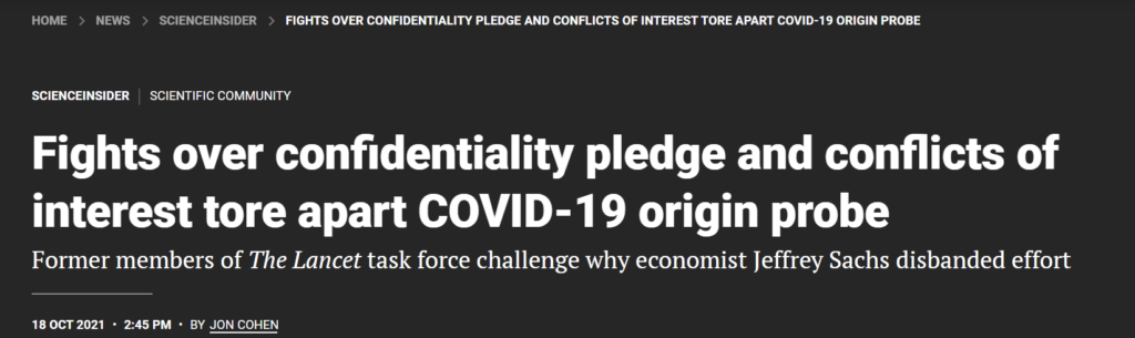这篇文章中说委员会主席、哥伦比亚大学经济学家萨克斯说,他担心12名任务组成员中的5人,包括最初和现在的主席,有潜在的利益冲突,因为他们与外国的一个实验室有直接和间接的关系,而该实验室正是起源辩论的中心。但现任主席杰拉尔德·库什(Gerald Keusch)指控说,萨克斯不相信特别工作组的成员会对实验室起源的假设进行公平的评估,并试图影响他们的工作方式,包括要求与辩论双方的专家进行秘密访谈,他们承诺不透露这些专家的身份。