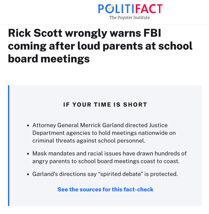 这则新闻是2021年10月发布的,最近又被翻出来再流传。2021年Politifact发布过相关核查。当时有佛罗里达州政客Rick Scott发推特称:“拜登政府的检察官想要FBI去调查家长,这些家长为了保护孩子可以不接受激进课程比如CRT而在校委会议上抗议。”