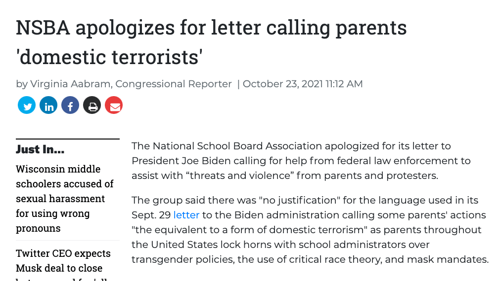 关于“国内恐怖主义分子”一词,其实是全国校委会协会(NSBA)在2021年9月29日给总统拜登的信,他们在信中写道希望联邦执法部门帮助处理来自家长和抗议者的‘威胁和暴力“,并称这种行为“相当于一种国内恐怖主义”。后来该组织道歉,认为这种”语言“是不够准确的,并表示未来会更慎重。