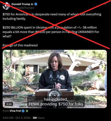 小川普使用了一段贺锦丽在佐治亚州奥古斯塔视察救灾工作时发表演讲时的片段,并配上了个人的评论:“为每个失去一切的受灾美国人发放750美元。花费2500亿美元援助3800万人口的乌克兰,约等于在狗日的乌克兰平均给每个人花了6500美元。为了什么?”