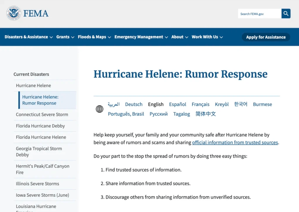 然而,由于右翼的大规模造谣,已经导致公众对FEMA的信任出现了动摇,影响应急救灾工作,为保证信息通畅,FEMA上周五就在其官网专门开辟了辟谣页面,针对社交媒体上的虚假信息进行及时辟谣,目前已经更新了10条。相关信息共有12种语言可供阅读,也包含了简体中文。