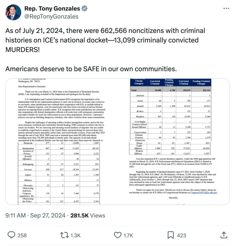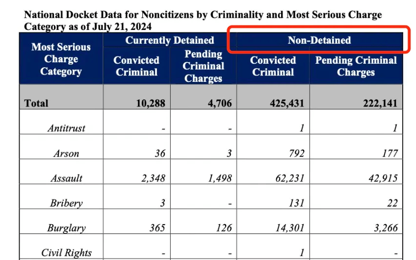 在发布这份报告时,冈萨雷斯说“截至2024年7月21日,根据ICE的全国档案,有662566名非公民有犯罪历史——其中有13099人是杀人犯。”