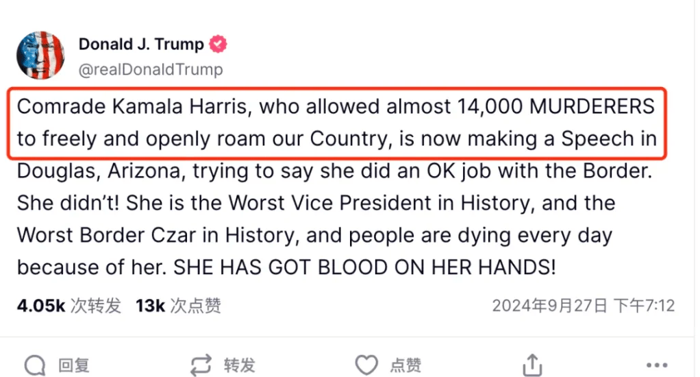 例如,川普就在9月27日发布的一条推文中声称,“贺锦丽允许14000名杀人犯自由地进入美国。”