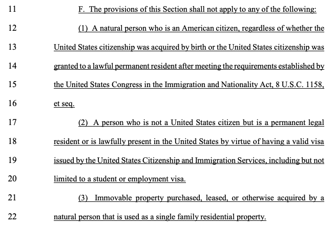 三版法案的总结概括均为一句话:规定禁止外国敌对者 (foreign adversary) 购买、租赁或收购土地。在初版文本中,明确指出“外国敌对者”为被确认为外国敌对者的个人或政府,包括中国、香港特别行政区、古巴、伊朗、朝鲜、俄罗斯和委内瑞拉。“与外国敌对者有关的人”指由外国敌对者拥有、控制或受其管辖或指挥的人,或代表外国敌对者、与外国敌对者共同行动的个人。不包括在美国有合法居留权的合法永久公民(注:也就是绿卡)。