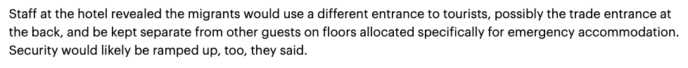 前文提到,酒店员工告诉《纽约邮报》,他们会提供一层楼来容纳移民。《每日邮报》同样指出:酒店员工表明移民将于游客使用不同的入口,可能位于酒店后侧的贸易运货入口、并且与其他客人分隔开,移民会使用专门用于紧急住宿的楼层。