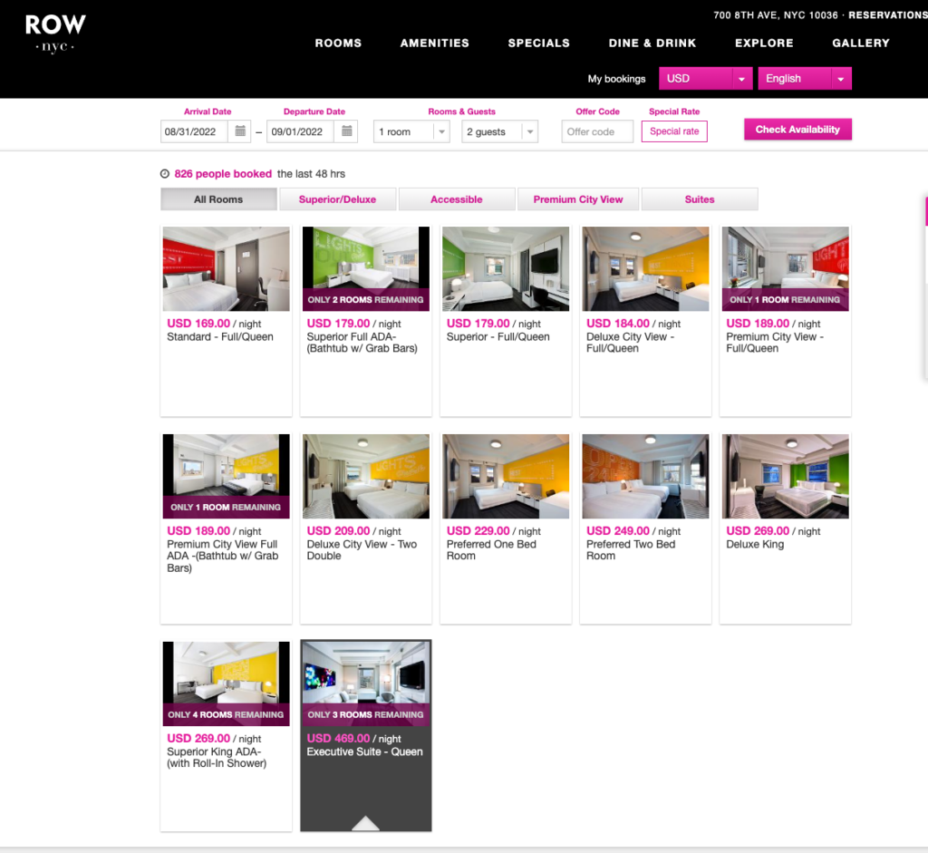 我们去Row NYC网站查看当晚房价,确实如此: