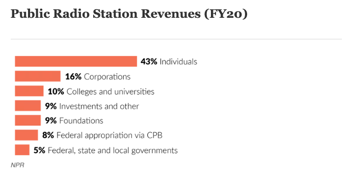 NPR是一个独立的、非营利的媒体机构,大部分直接财政支持来自两个方面:其一是企业赞助,其二是数百个成员电台支付的费用。NPR间接获得联邦资金,通过CPB的年度拨款在支持成员电台方面发挥了重要作用。同时,这些成员电台从整个公共媒体生态系统中购买节目和内容,不仅仅来自NPR。成员电台也并不是完全由联邦资助的,它们也依靠听众的捐款和其他收入。另外,NPR的董事会是在没有任何政府影响的情况下任命的。