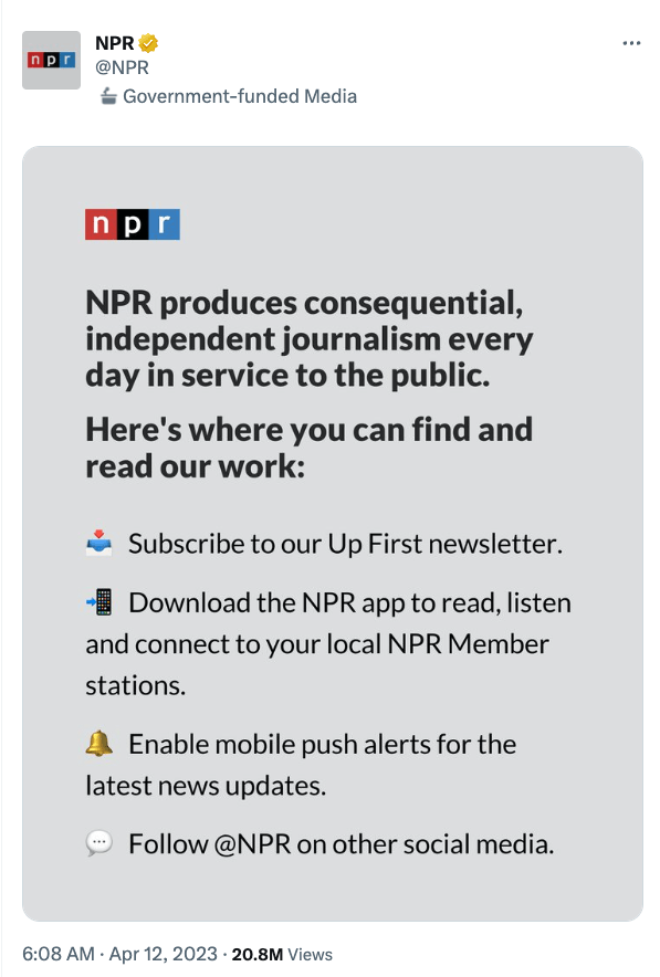 在NPR最后一条推文中这样写道:“NPR每天制作有影响的独立新闻,为公众服务。”并建议读者去通过其他渠道接收NPR的更新。直到NPR离开推特时,其账号仍被标记为“由政府资助的媒体”。