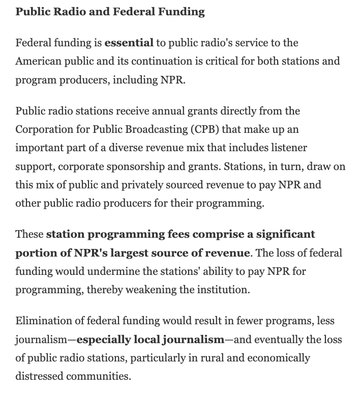 NPR强调了联邦资金对新闻业的重要性,如果取消联邦资金将导致节目减少、最终导致公共广播电台消失,尤其是在农村和经济困难的社区。