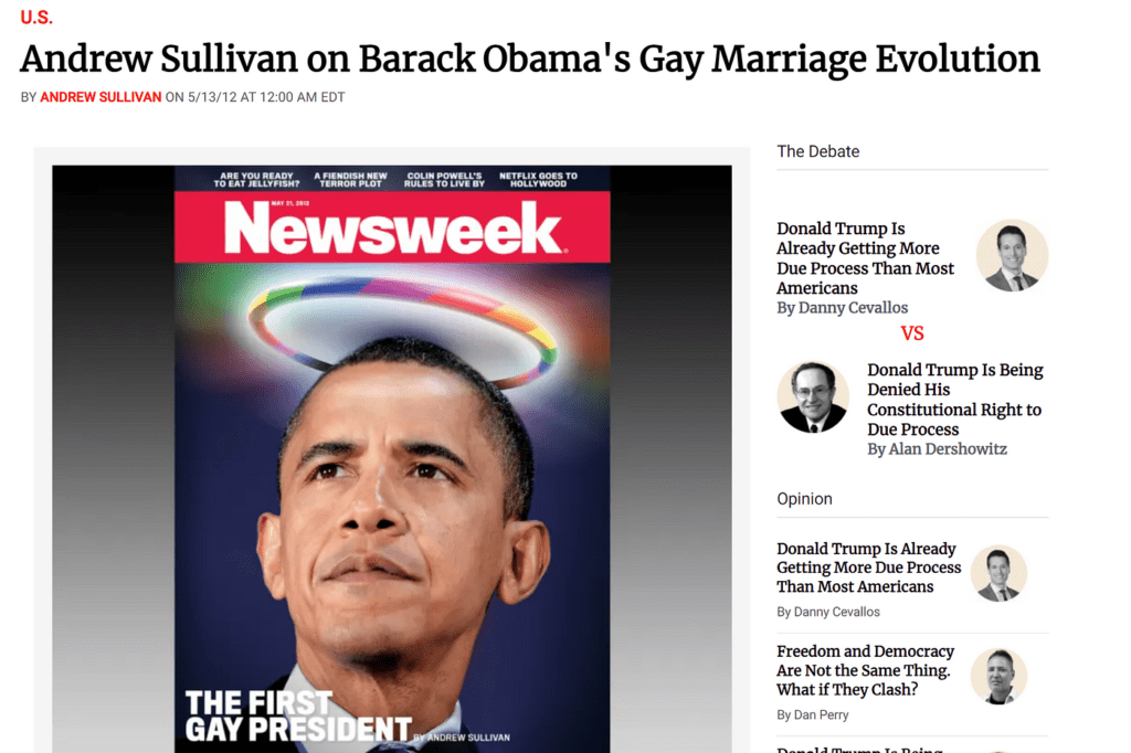 新闻周刊的这期封面文章确实有,它是2012年5月发表的,出现在网上和报摊上。杂志封面是为了推销保守派记者安德鲁·沙利文(Andrew Sullivan)撰写的一篇关于奥巴马多年来在同性恋婚姻问题上立场转变的内幕报道。