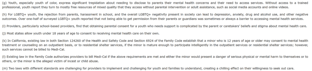该法案如获通过,将允许12至17岁的未成年人在门诊服务或庇护所服务中接受心理健康专业人员的治疗,而无需征得父母的同意或通知,前提是该儿童被认为“足够成熟,能够明智地参与”,且父母的参与被确定为“不适当”。