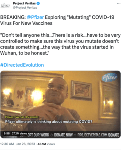 【来源及背景】Project Veritas在推特发出一条“爆炸性新闻”,称辉瑞高管承认辉瑞为了销售疫苗牟利而研制出新冠病毒。此推文已有超过四千万浏览量。